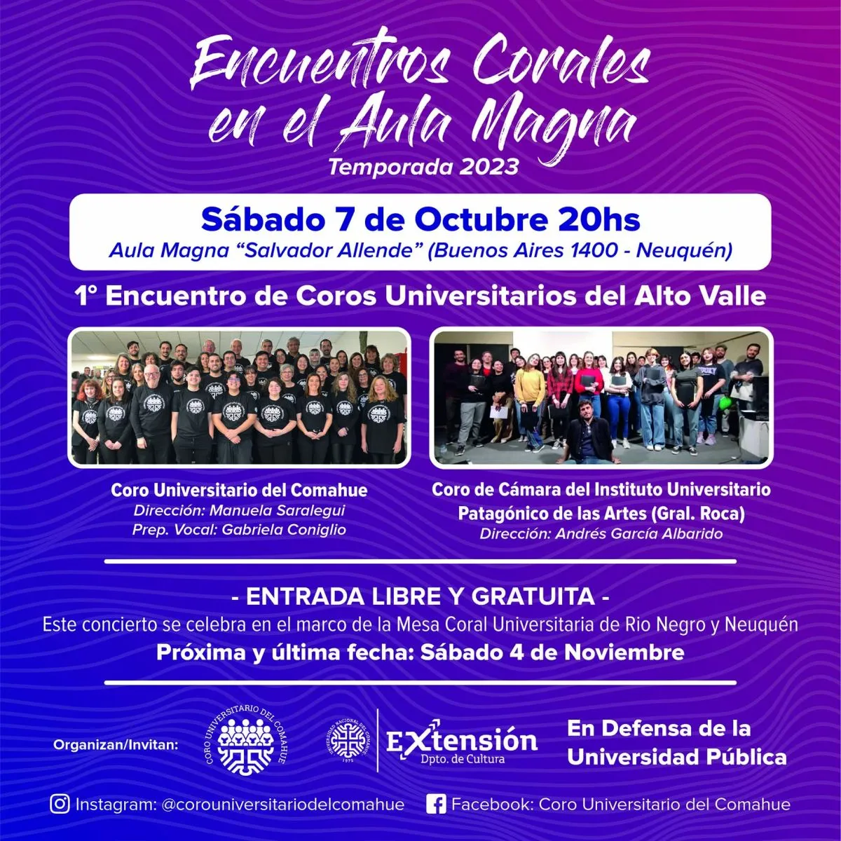 El Departamento de Cultura de la Secretaría de Extensión Universitaria y el Coro Universitario del Comahue de la Universidad Nacional del Comahue invitan a un nuevo encuentro coral a celebrarse el próximo sábado 7 de octubre a las 20 h en el Aula Magna “Salvador Allende” de nuestra Universidad, con entrada libre y gratuita.