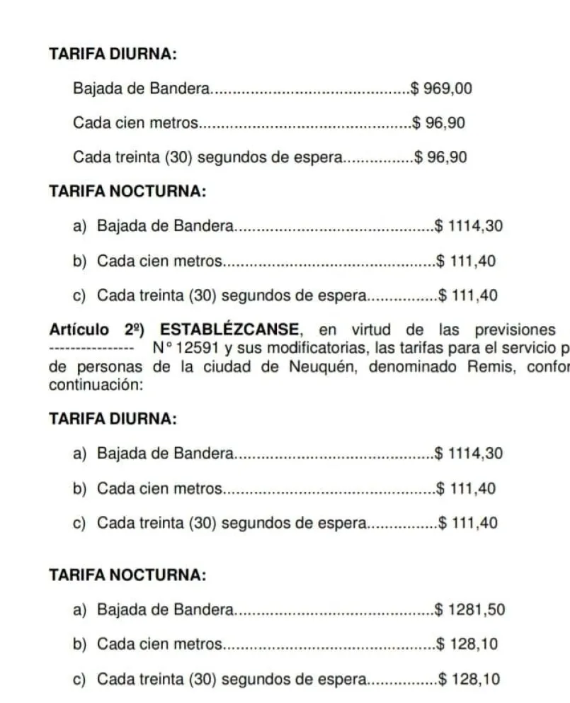 Esta semana comenzó a regir en la ciudad de Neuquén un nuevo incremento de 131,82% en el servicio de taxis, que pasó a costar $969 la bajada de bandera diurna y $114,30 y la tarifa nocturna.