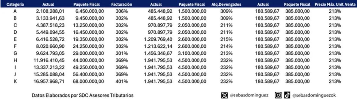 Según la categoría, los montos de facturación aumentan del 301% al 401% y el monto de los alquileres devengados anuales aumentan del 211% al 309%.