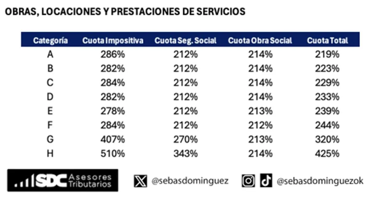 Para el caso de obras locaciones y prestaciones de servicios, la cuota impositiva aumenta entre el 278% y 510%, la cuota de seguridad social entre el 212% y 343% y la cuota de obra social entre 212% y 214%.