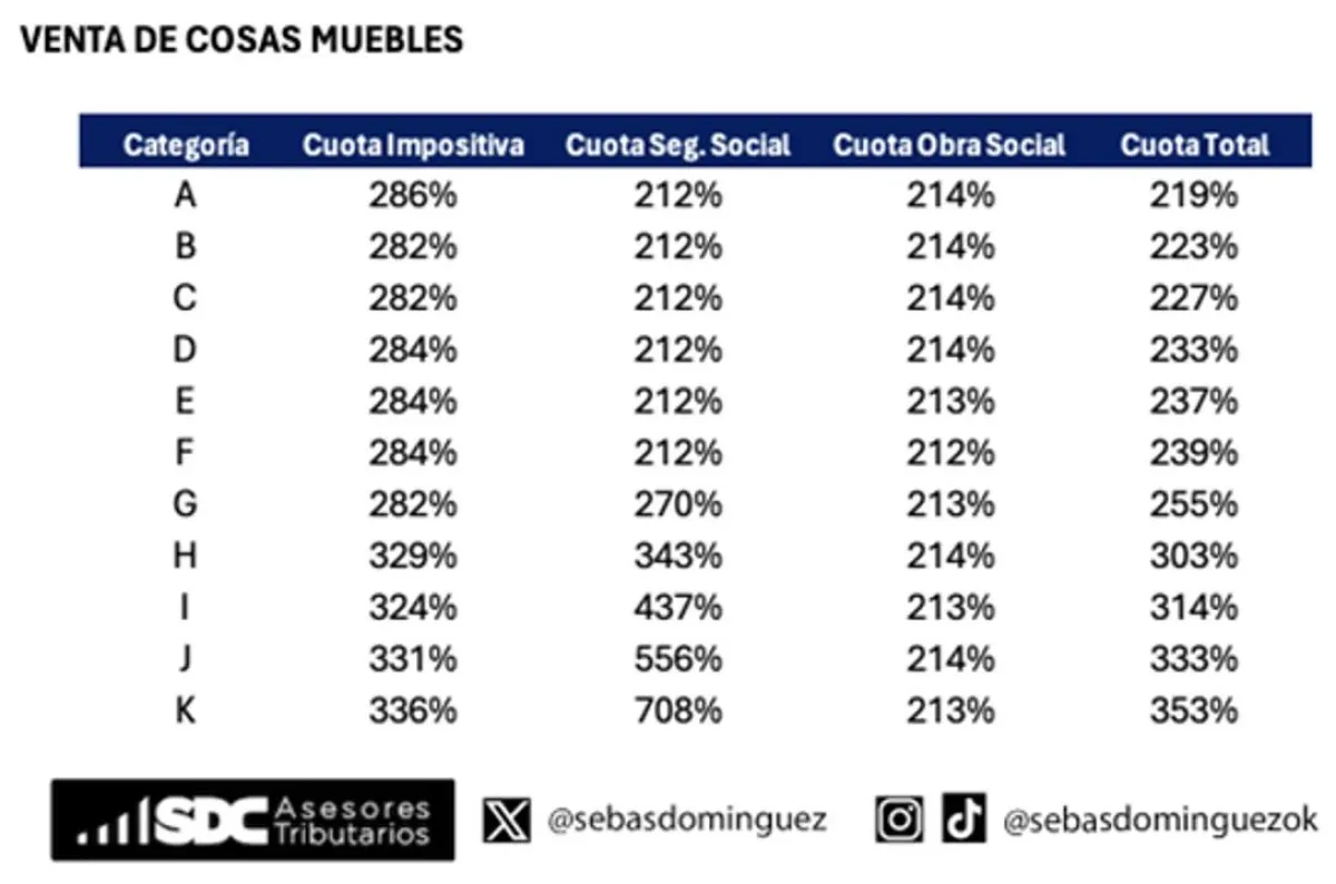 En el caso de venta de bienes (cosas muebles), la cuota impositiva aumenta entre el 282% y 336%, la cuota de seguridad social entre el 212% y 708% y la cuota de obra social entre 212% y 214%.