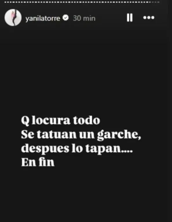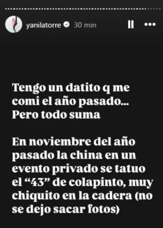 "Tengo un datito que me comí el año pasado... pero todo suma. En noviembre del año pasado, la China se tatuó en un evento privado el '43' de Franco Colapinto, muy chiquito en la cadera. No dejó que le sacaran fotos", escribió en su cuenta de Instagram la panelista de LAM.