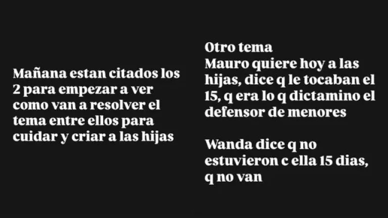 Tras compartir la “primicia”, Yanina actualizó la información sobre la causa entre el futbolista y la conductora de Telefe: “Mañana están citados los dos para empezar a ver como van a resolver el tema entre ellos, para cuidar y criar a las hijas. Otro tema, Mauro quiere hoy a las hijas, dice que le tocaban él, que era lo que dictamino el defensor. Wanda dice que no estuvieron con ella 15 días, que no van”.