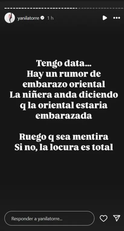 “Tengo data… Hay un rumor de embarazo oriental. La niñera anda diciendo que la oriental estaría embarazada", informó y sumó: ”Ruego que sea mentira, si no, la locura es total".