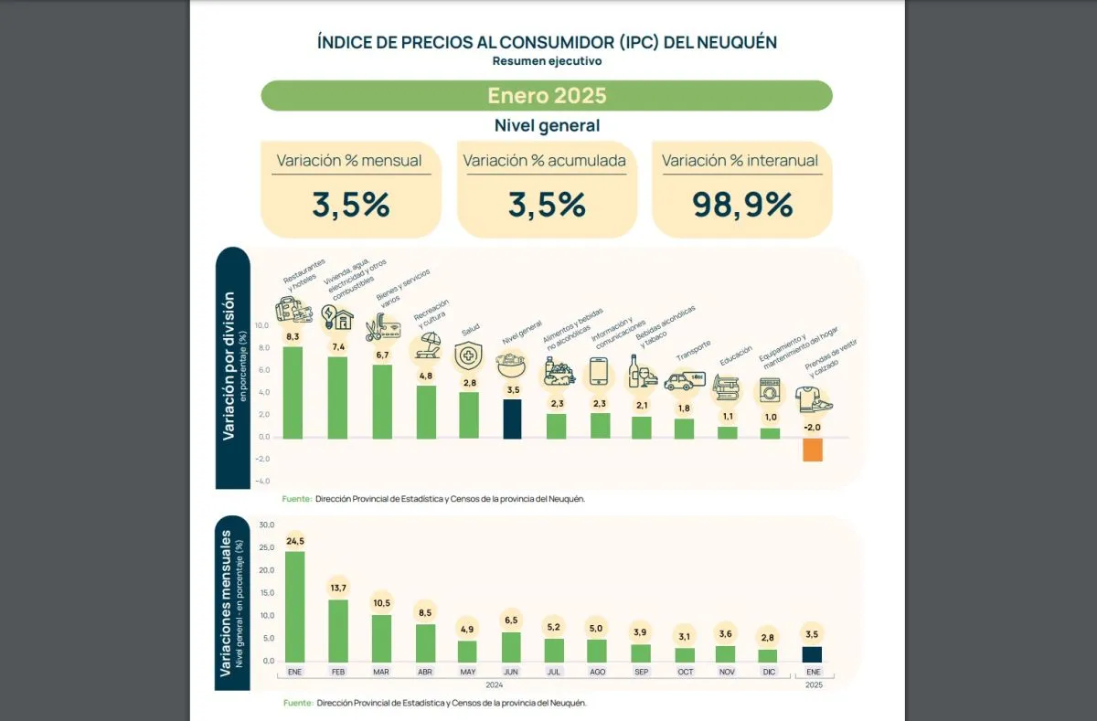 La Dirección de Estadísticas y Censos de Neuquén difundió este jueves el índice de precios al consumidor (IPC) de enero 2025.