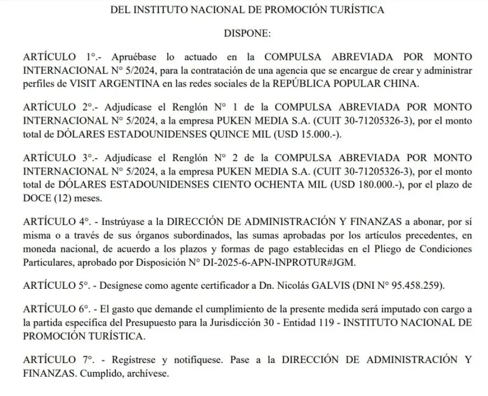 El Instituto Nacional de Promoción Turística (INPROTUR), organismo dependiente de la Jefatura de Gabinete de Ministros, adjudicó un contrato por USD 195.000 para la creación y administración de perfiles de redes sociales de "Visit Argentina" en la República Popular China. La contratación recayó en la empresa Puken Media S.A., lo que equivale a aproximadamente $238.875.000 según la cotización de $1.225 por dólar.