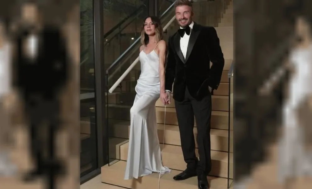 El astro del futbol posó junto a su esposa en la exclusiva fiesta del ex futbolista inglés y propietario del Inter de Miami.