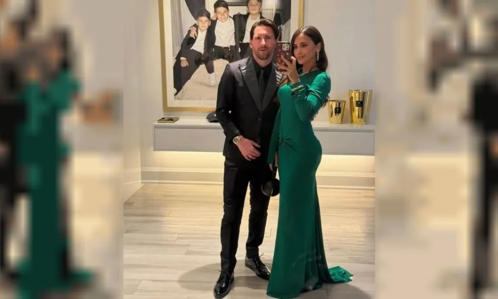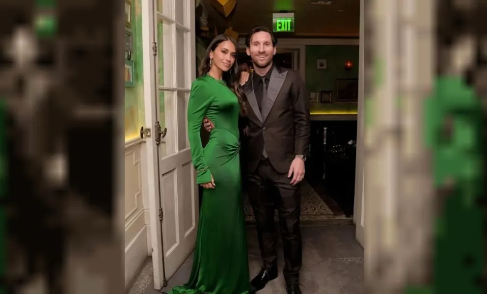 Antonela Rocuzzo y Leo Messi lucieron impecables atuendos de gala: él un traje entallado color negro, combinado con zapatos del mismo color, mientras que ella lució un vestido largo hasta sus pies, de seda verde.