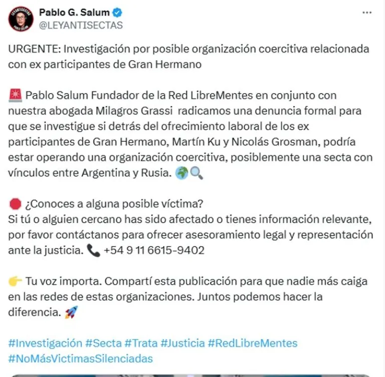 "Radicamos una denuncia formal para que se investigue si detrás del ofrecimiento laboral participantes de Gran Hermano, Martín Ku y Nicolás Grosman, podría estar operando una organización coercitiva, posiblemente con vínculos entre Argentina y Rusia", explicó el activista.
