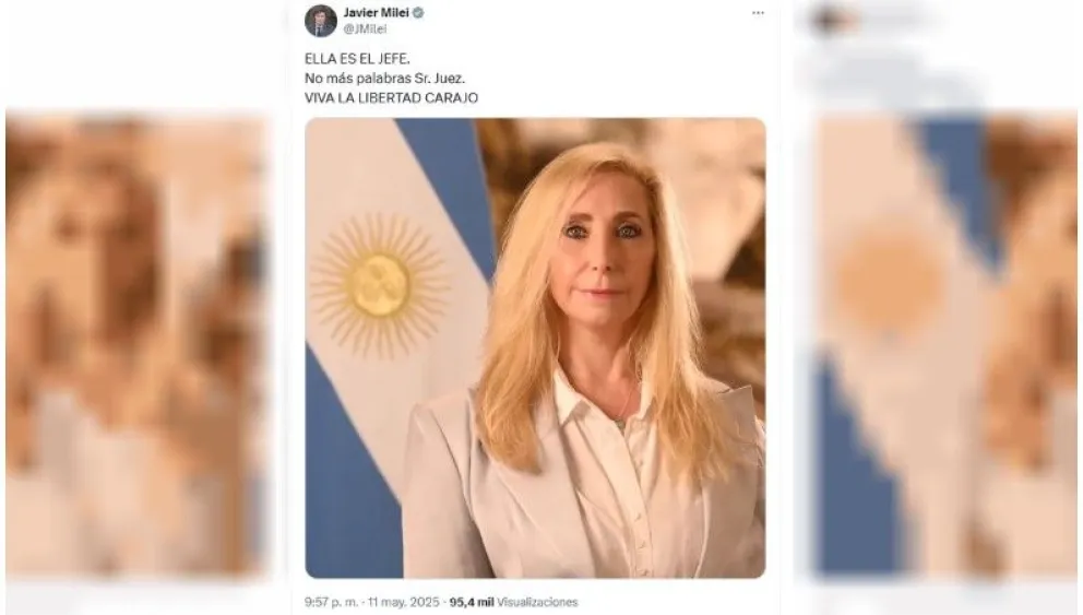 El presidente Javier Milei celebró esta noche los resultados electorales en Chaco y Salta con una publicación en redes sociales en la que reafirmó el liderazgo político de su hermana y secretaria general de la Presidencia, Karina Milei. En el posteo, ilustrado con una foto institucional, escribió: “Ella es el jefe. No más palabras Sr. Juez. ¡Viva la libertad, carajo!”.