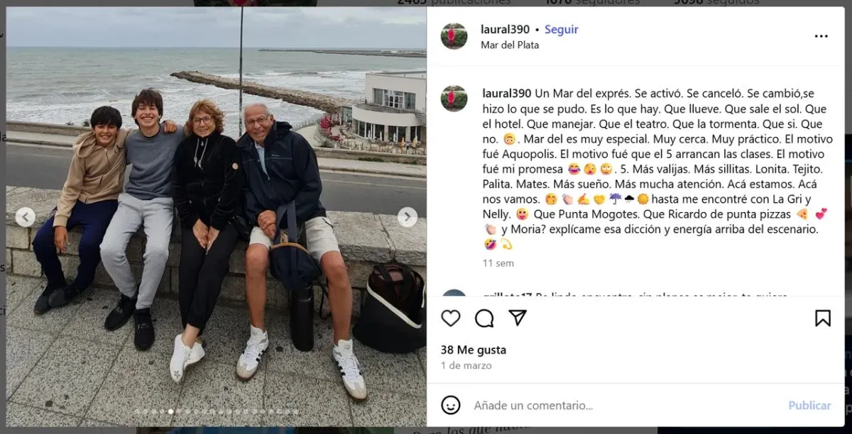 Con casi 2500 publicaciones y más de 1600 seguidores, la última que realizó Leguizamón es un viaje que hizo en marzo de este año con sus dos hijos adolescentes y sus papás a Mar del Plata.
