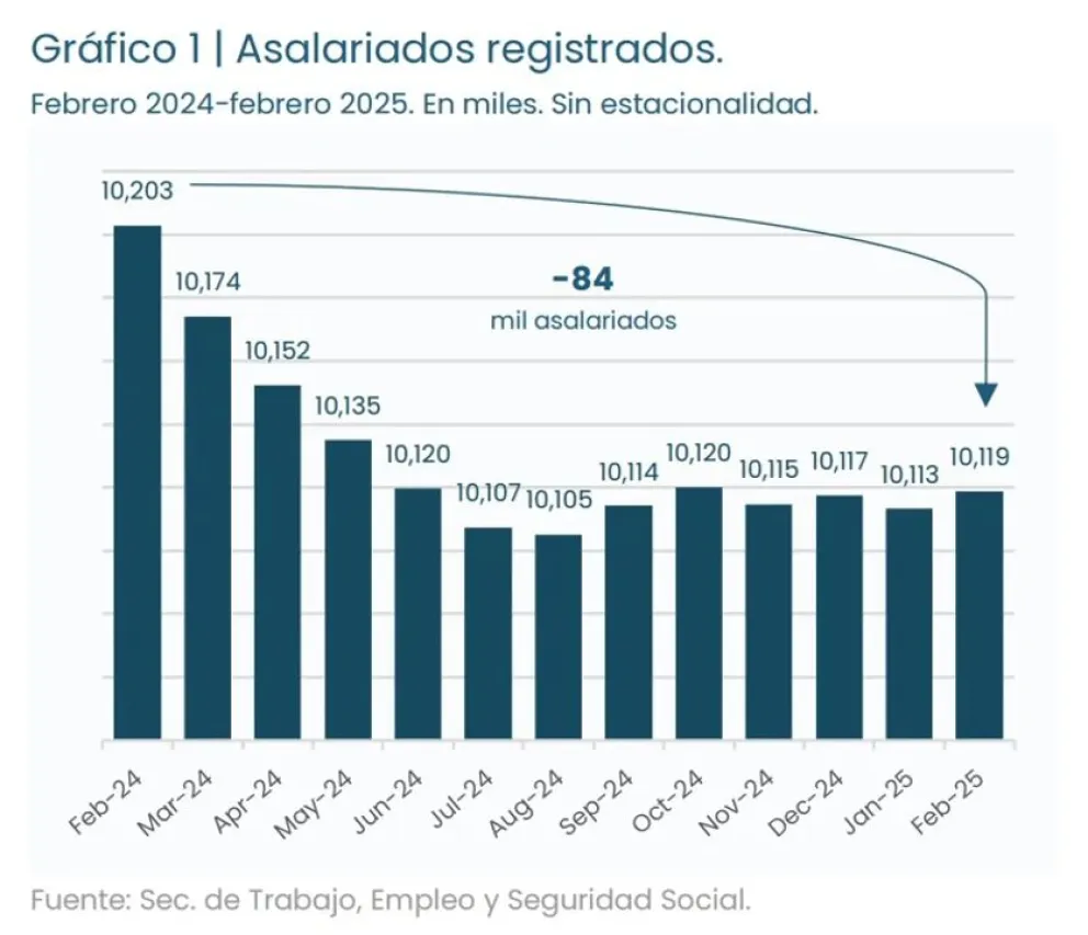 Por su parte, en febrero de 2025 (último dato disponible) aproximadamente 10.119 personas se convirtieron en trabajadores asalariados registrados en la seguridad social, de acuerdo a los datos desestacionalizados del Sistema Integrado Previsional Argentino (SIPA).