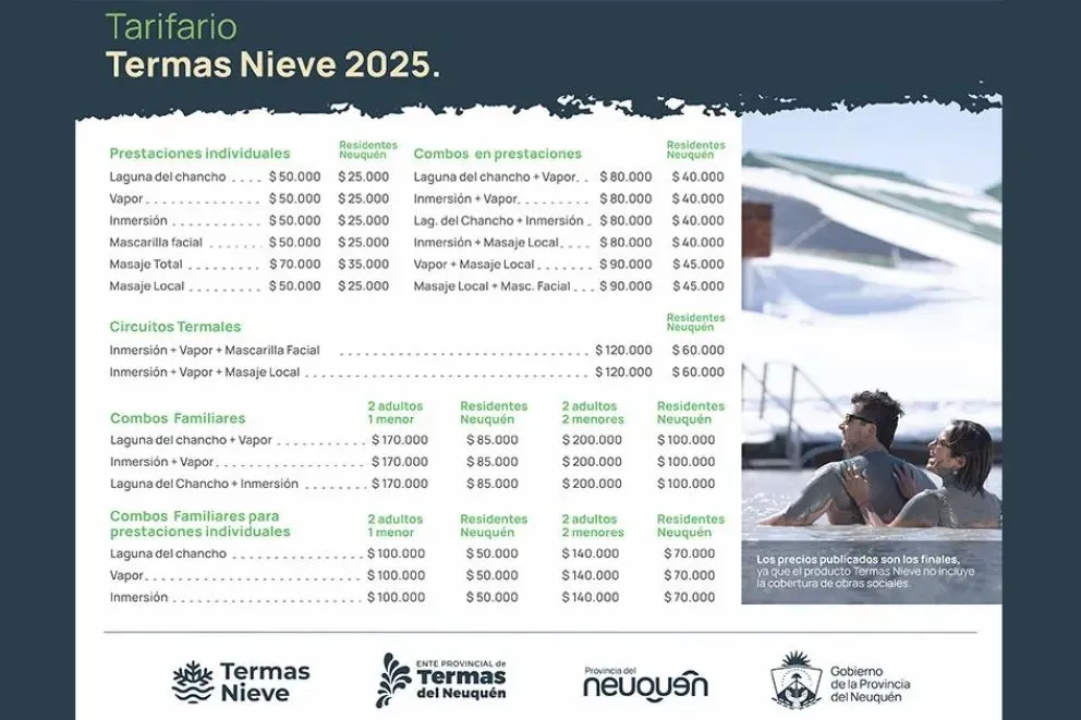 El Ente Provincial de Termas de Neuquén (Eproten), en sintonía con el turismo de cercanía, dispuso que las prestaciones del producto Termas Nieve tengan un descuento exclusivo del 50% para aquellas personas que residan en la provincia.