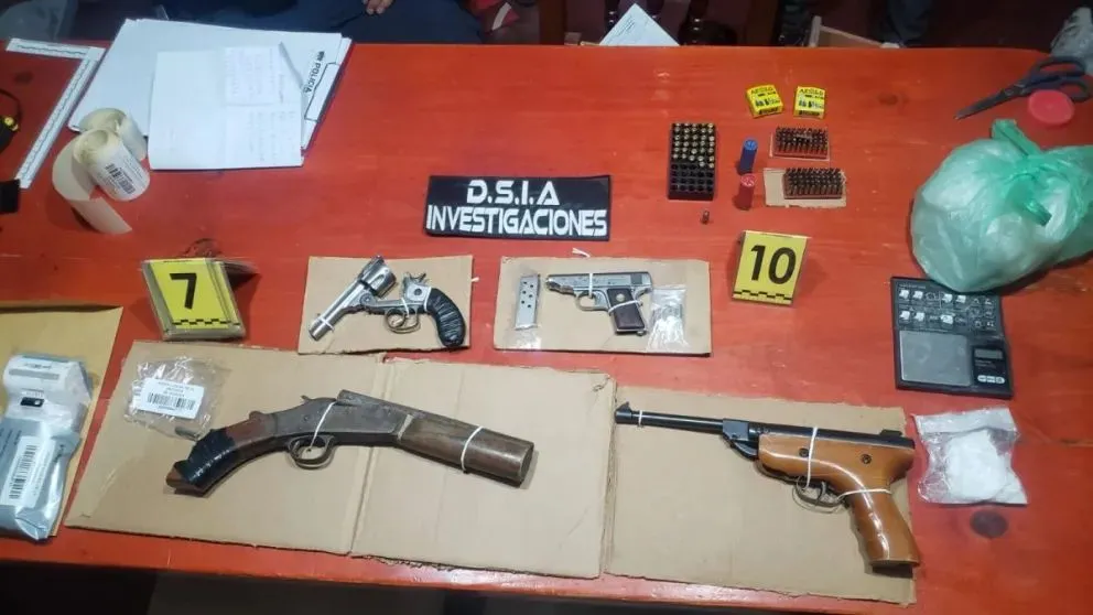 Durante los allanamientos, se incautó clorhidrato de cocaína, con un peso aproximado de 76 gramos, además de balanzas de precisión y recipientes con restos de drogas. Además, se secuestraron un revólver gris sin numeración, una pistola, una escopeta recortada de origen rudimentario y municiones de calibres 12, 16 y 22.