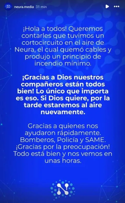 Afortunadamente, ninguno de los empleados que se encontraban en el lugar resultó herido. Desde Neura Media aseguraron que esperan poder continuar con la programación habitual durante la tarde de este mismo viernes.