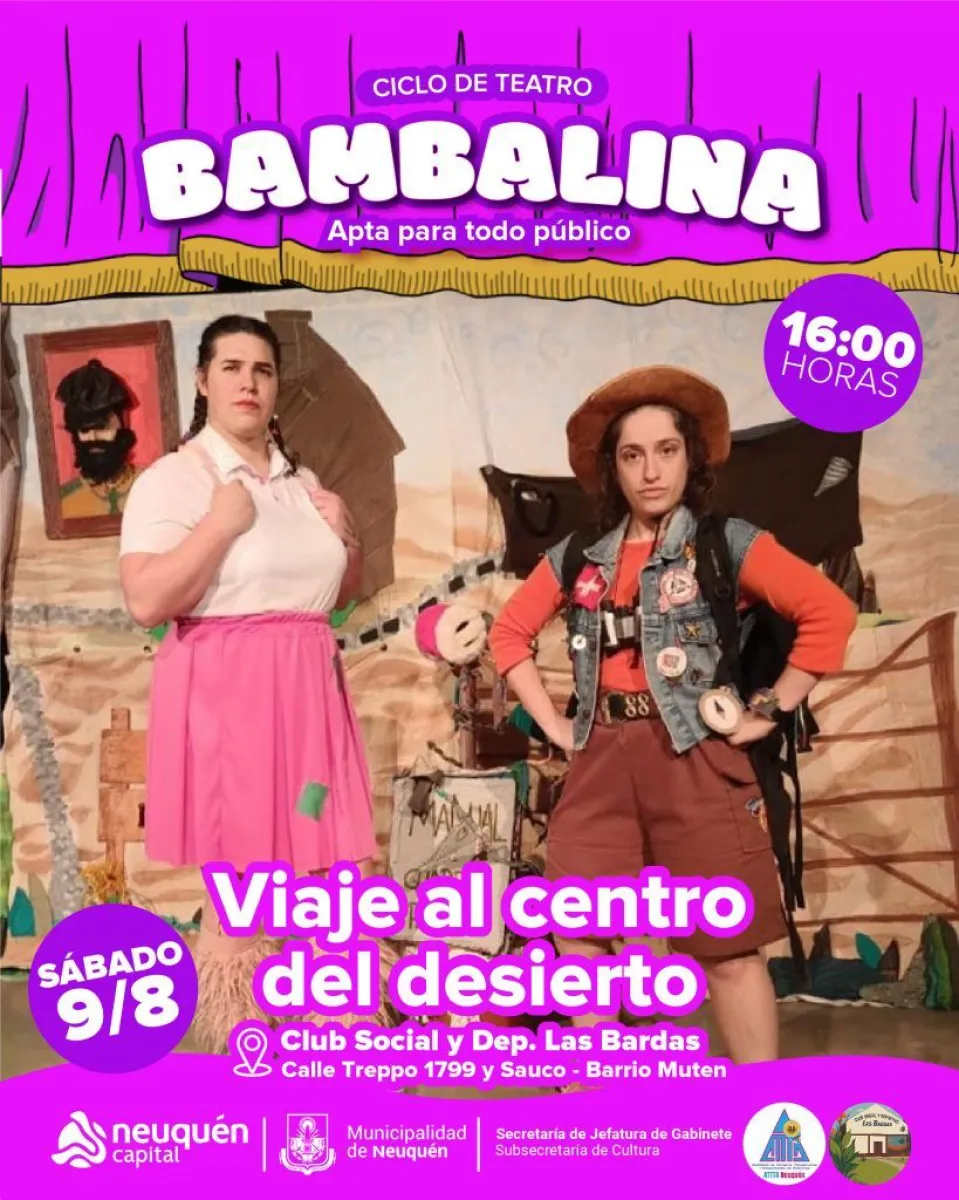 El grupo Bambalina subirá a escena con Viaje al centro del desierto, una obra escrita e interpretada por Marina Gala Di Giovanni y Sofy Ávila. La propuesta, en tono de comedia, entrelaza la amistad de dos protagonistas con momentos claves: una herencia misteriosa, puertas que se resisten a abrir y un viaje hacia lo desconocido en lo más recóndito de la Patagonia.