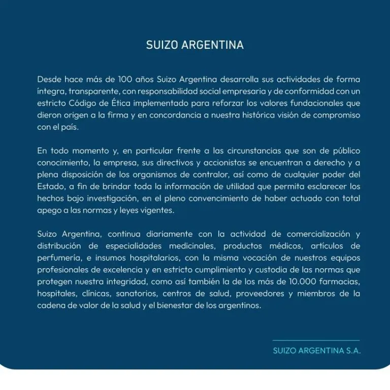 - Compromiso con la integridad: Suizo Argentina finaliza el texto reafirmando su "compromiso con el país" y el "estricto cumplimiento y custodia de las normas que protegen nuestra integridad".