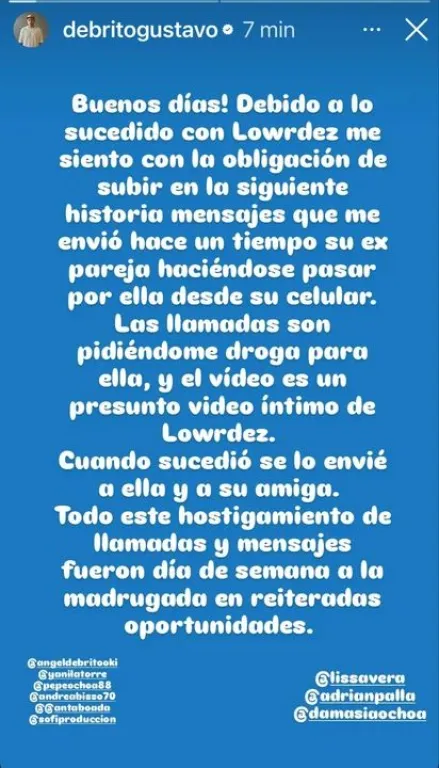“Buenos días! Debido a lo sucedido con Lowrdez me siento con la obligación de subir en la siguiente historia mensajes que me envió hace un tiempo su ex pareja haciéndose pasar por ella desde su celular. Las llamadas son pidiéndome droga para ella, y el vídeo es un presunto video íntimo de Lowrdez”, expresó haciendo publicas las capturas.