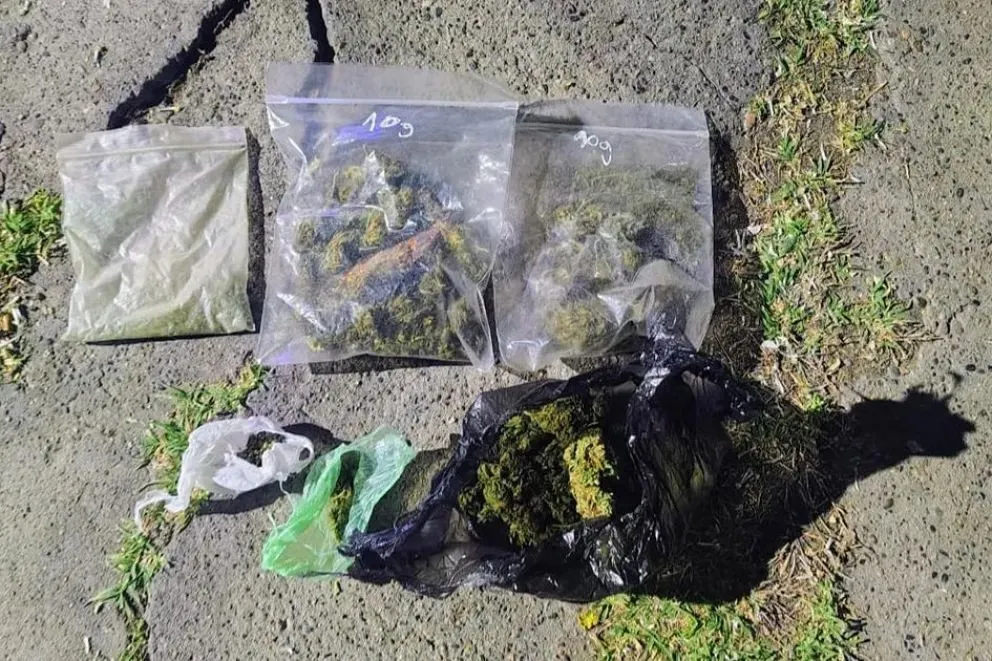 Durante el procedimiento, uno de los individuos, de 25 años, descendió portando una bolsa de compras color verde. Al ser consultado, exhibió voluntariamente tres bolsas tipo ziploc transparentes y una bolsa negra con sustancia vegetal similar a cannabis, además de una balanza digital de mano y dos envoltorios adicionales con la misma sustancia. El joven manifestó que la sustancia era marihuana destinada a consumo personal.