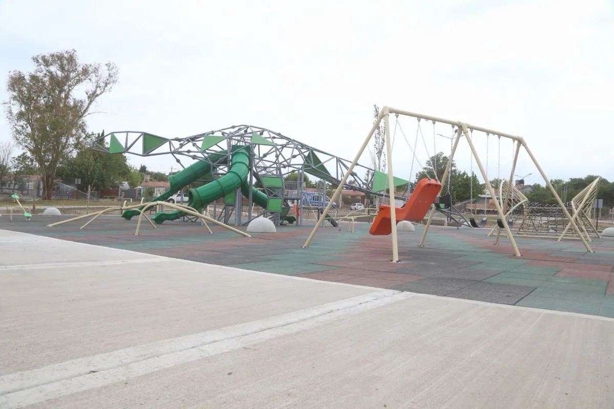 El parque se complementa con hamacas, sube y baja, juegos inclusivos y piso antigolpes, dentro de una intervención integral de 1,5 hectáreas. Además, se incorporaron cancha de fútbol tenis, cancha de básquet 3x3, posta saludable con cinco estaciones de baja intensidad, circuito de calistenia y sectores de descanso con mesas y bancos.