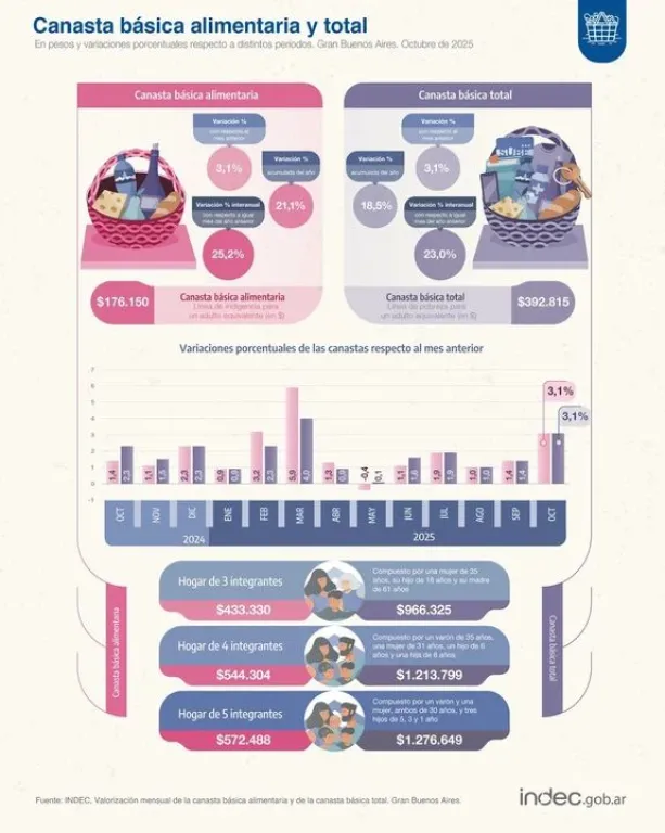 En comparación con el décimo mes del 2024, se registraron subas del 25,2% para la CBA y 23% para la CBT, según lo difundido por el organismo.