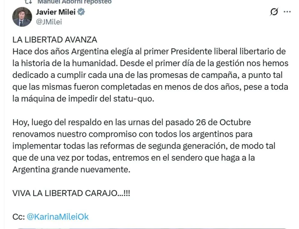 A través de su cuenta de X, y a dos años del acontecimiento, el mandatario expresó: "LA LIBERTAD AVANZA Hace dos años Argentina elegía al primer Presidente liberal libertario de la historia de la humanidad".