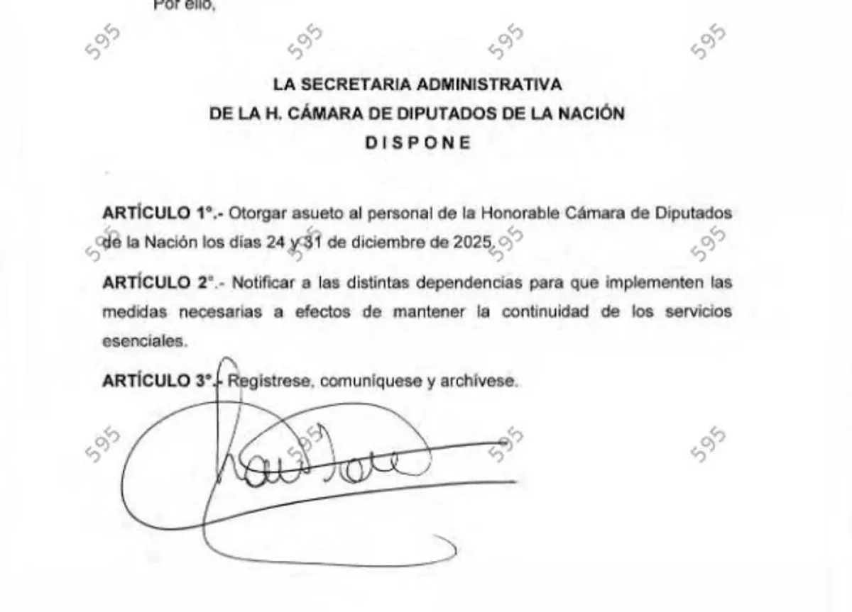 El presidente de la Cámara de Diputados, Martín Menem, otorgó asueto administrativo a los empleados de la Cámara de Diputados para los días 24 y 31 de diciembre con motivo de la celebración de Navidad y Año Nuevo.