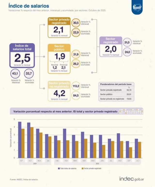 El índice de salarios informado por el Instituto Nacional de Estadística y Censos (INDEC) arrojó, octubre, una suba de 2,5% mensual, quedando por encima del costo de vida de ese mes, que fue del 2,3%.