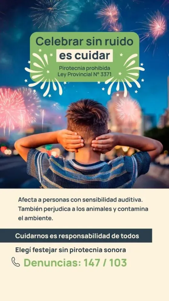 El uso de fuegos artificiales y otros artefactos explosivos está vedado por ley en la provincia por sus efectos nocivos en personas con sensibilidad auditiva y animales. Las multas son millonarias y las denuncias pueden realizarse de forma anónima y gratuita.