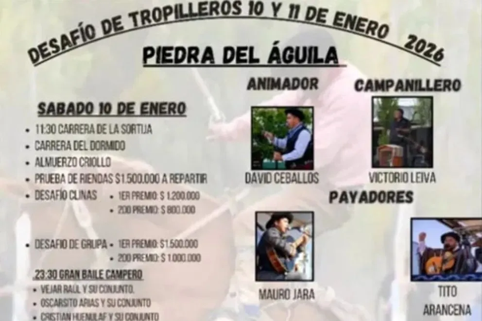 El 10 y 11 de enero se realizará una nueva edición del Desafío de Tropilleros en el predio de Herencia Gaucha, de Piedra del Águila. El evento familiar propone destrezas criollas, montas en bastos, clina y grupa y juegos gauchescos y baile popular.