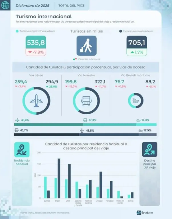 El ingreso de turistas a la Argentina cayó 7,9% durante diciembre, mientras que aumentaron 1,7% las salidas del país de los mismos, según informó el Instituto Nacional de Estadísticas y Censos (INDEC).