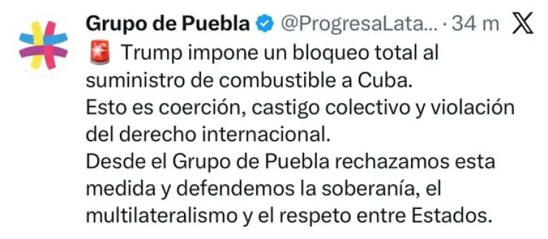 Por su parte, el Grupo de Puebla, que reúne a ex presidentes y distintos sectores del progresismo de la región, denunció que el presidente estadounidense, Donald Trump, “impone un bloqueo total al suministro de combustible a Cuba”.