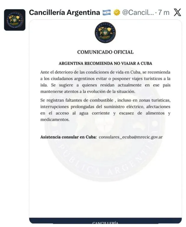 “Ante el deterioro de las condiciones de vida en Cuba, se recomienda a los ciudadanos argentinos evitar o posponer viajes turísticos a la isla. Se sugiere a quienes residan actualmente en ese país mantenerse atentos a la evolución de la situación”, indicó la Cancillería, que conduce Pablo Quirno.