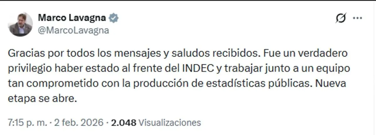 Tras presentar su renuncia como director del Instituto Nacional de Estadística y Censos (Indec), Marco Lavagna agradeció este lunes “los mensajes y saludos recibidos” y aseguró que “fue un privilegio haber estado al frente” del organismo estadístico.