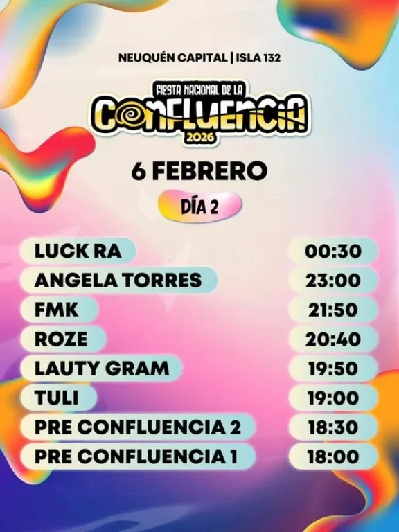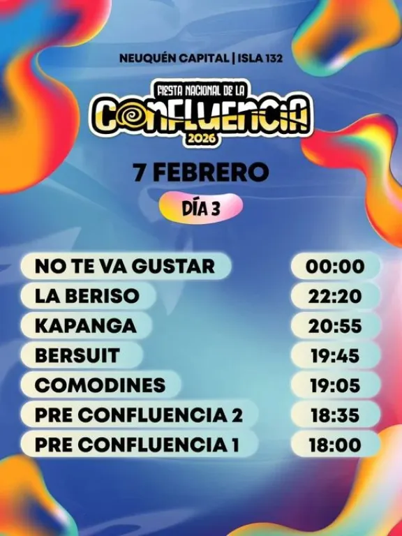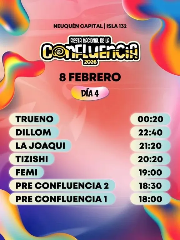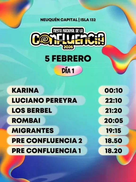 La 13° edición de la Fiesta Nacional de la Confluencia 2026 comenzó este jueves 5 y se extenderá hasta el 8 de febrero, en el tradicional predio de la Isla 132 del Paseo Costero frente al río Limay.