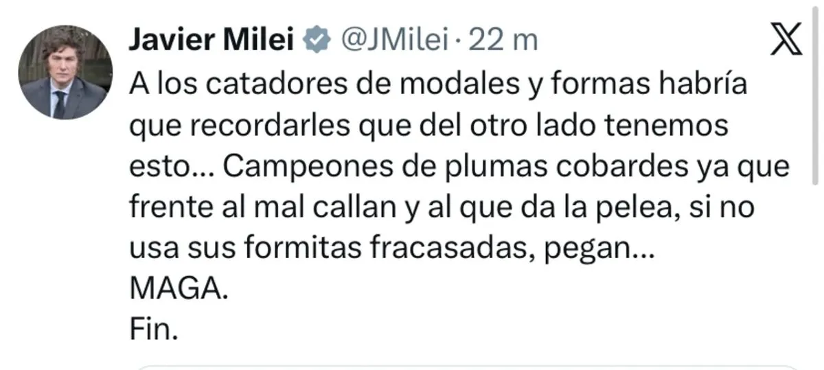 “A los catadores de modales y formas habría que recordarles que del otro lado tenemos esto... Campeones de plumas cobardes ya que frente al mal callan y al que da la pelea, si no usa sus formitas fracasadas, pegan”, expresó el presidente Javier Milei.