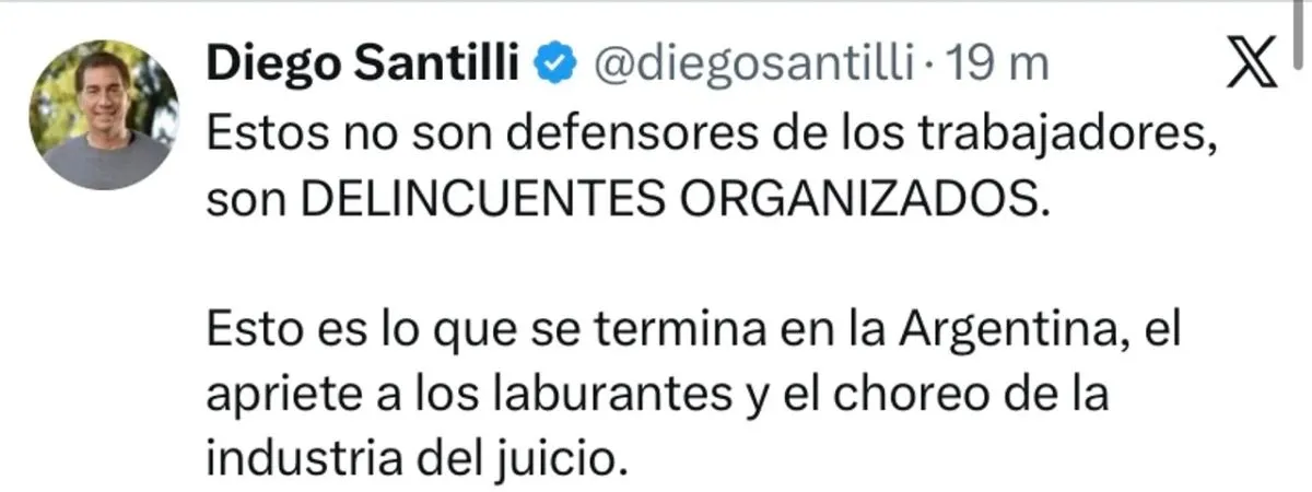 “Estos no son defensores de los trabajadores, son delincuente organizados. Esto es lo que se termina en la Argentina, el apriete a los laburantes y el choreo de la industria del juicio”, expresó el ministro del Interior, Diego Santilli, desde sus redes sociales.