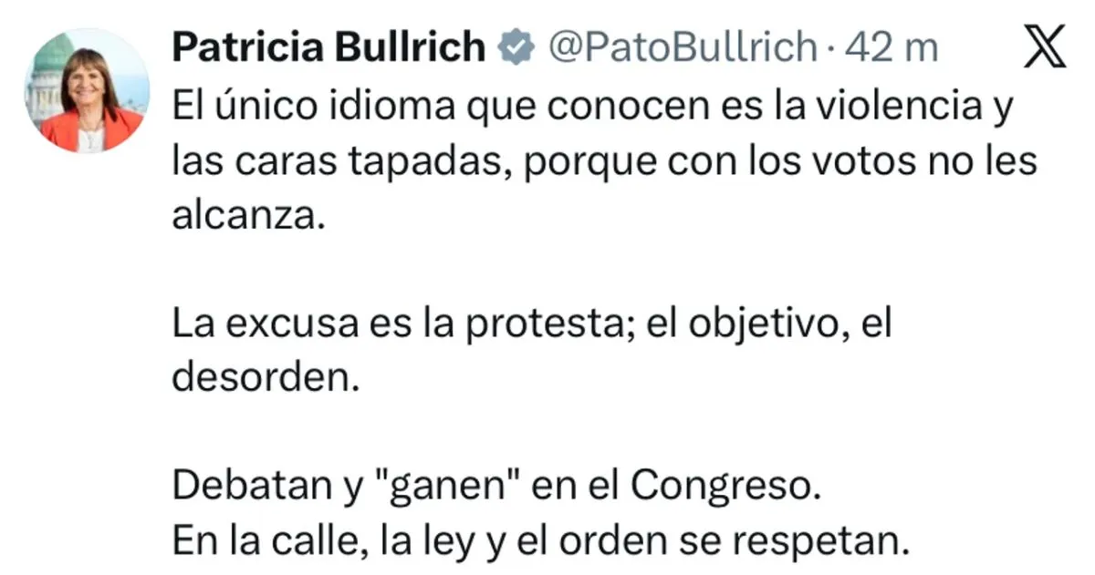 Por su parte, la jefa del bloque de senadores libertarios, Patricia Bullrich, consideró que “el único idioma que conocen es la violencia y las caras tapadas, porque con los votos no les alcanza”.
