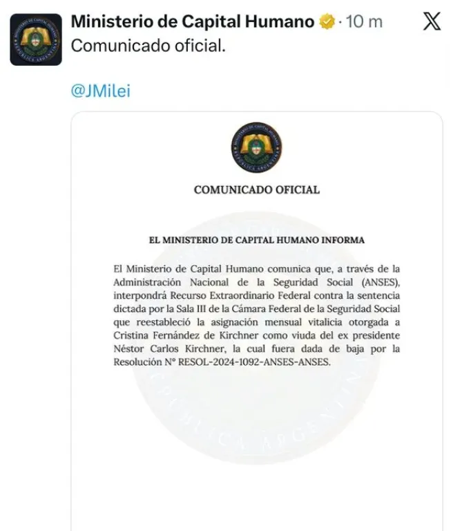 De todos modos, el Ministerio de Capital Humano interpondrá a través del ANSES un recurso extraordinario federal contra la sentencia dictada por la Sala III de la Cámara Federal de la Seguridad Social.