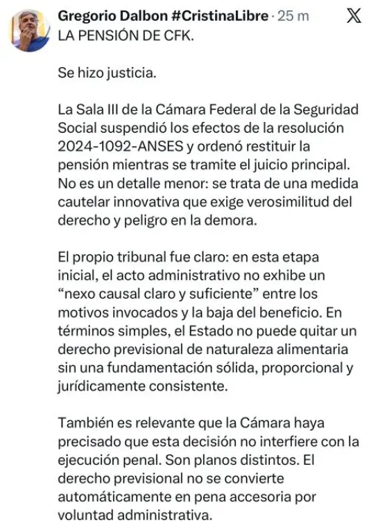 El abogado Gregorio Dalbón, que representa a la ex mandataria en causas civiles, dijo que “se hizo justicia” porque el propio tribunal “fue claro” al consignar que "en esta etapa inicial, el acto administrativo no exhibe un ‘nexo causal claro y suficiente’ entre los motivos invocados y la baja del beneficio.