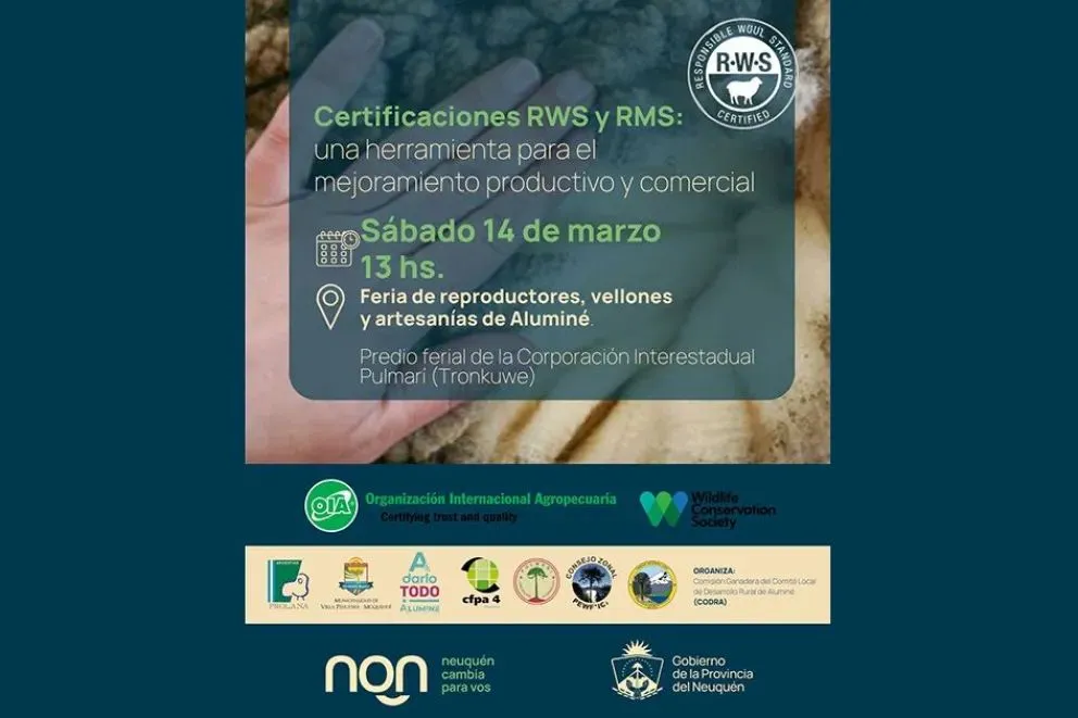 Como parte de la Feria de Reproductores, Artesanos y Vellones de Aluminé, el gobierno provincial acompañará la realización del Taller “RWS-RMS, una herramienta para el mejoramiento productivo y comercial”. Se trata de una propuesta de formación orientada a fortalecer la producción sustentable y la competitividad del sector lanero y de la fibra mohair neuquina.