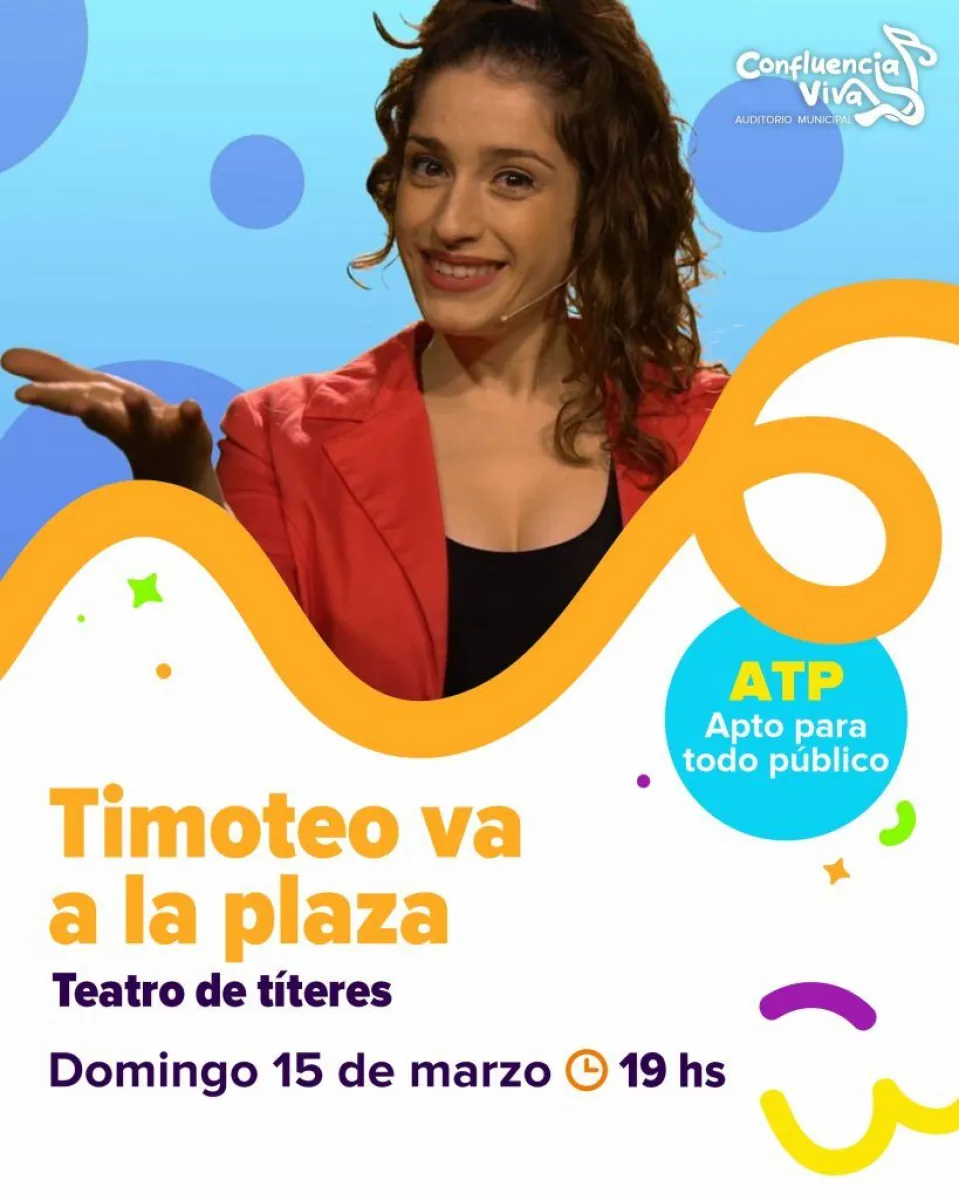 El Auditorio Municipal “Confluencia Viva”, ubicado en el primer subsuelo de la Municipalidad de Avenida Argentina y Roca, invita a las familias a participar este domingo a las 19 de la presentación del espectáculo de títeres “Timoteo va a la plaza”.