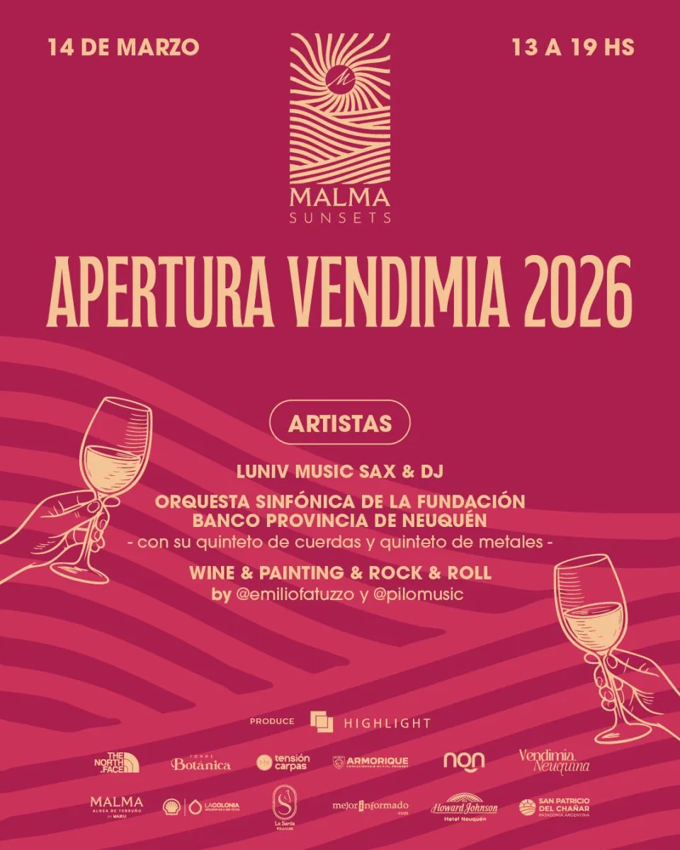 De 13 a 19 horas, el predio de Bodega Malma —ubicado en San Patricio del Chañar, a solo una hora de Neuquén capital— se transformará en un gran escenario al aire libre para disfrutar del paisaje patagónico en plena época de vendimia.