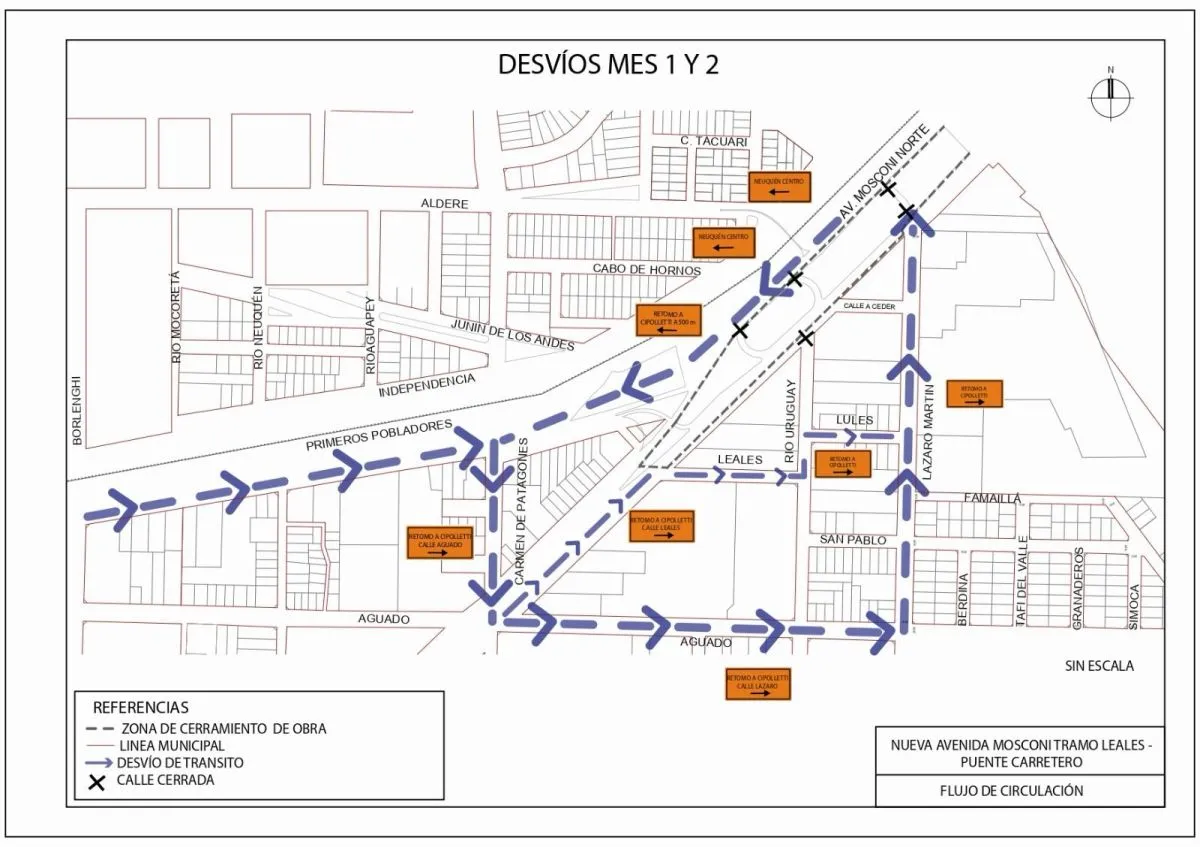 Durante los primeros 60 días, los trabajos se concentran en la colectora en sentido Neuquén–Cipolletti. En ese período se implementa un esquema de desvíos organizado: los vehículos deben desviar por calle Aguado, continuar por Lázaro Martín y retomar el acceso al puente.