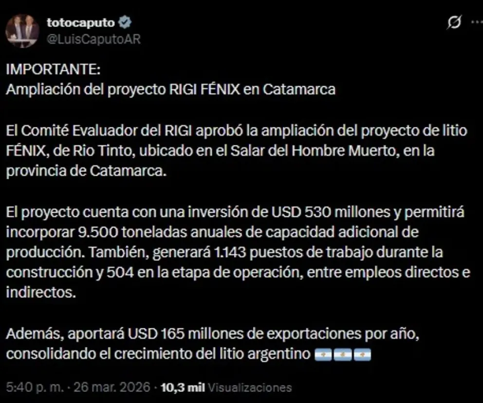 Con un nuevo posteo en su red social X, el ministro Caputo contó que “el Comité Evaluador del RIGI aprobó la ampliación del proyecto de litio FÉNIX, de Rio Tinto, ubicado en el Salar del Hombre Muerto, en la provincia de Catamarca”.