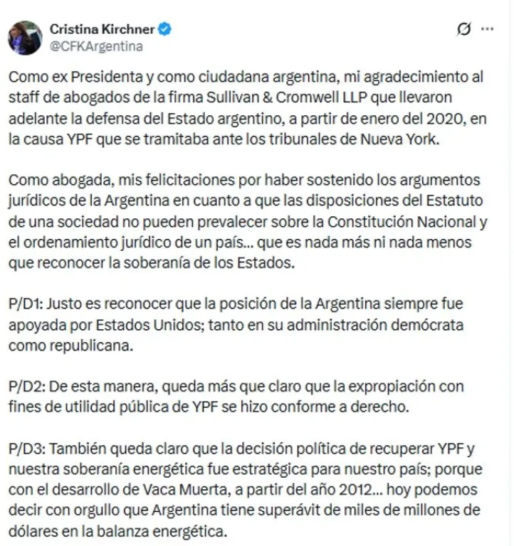“Como ex presidenta y como ciudadana argentina, mi agradecimiento al staff de abogados de la firma Sullivan & Cromwell LLP que llevaron adelante la defensa del Estado argentino, a partir de enero del 2020, en la causa YPF que se tramitaba ante los tribunales de Nueva York”, expresó la ex mandataria.