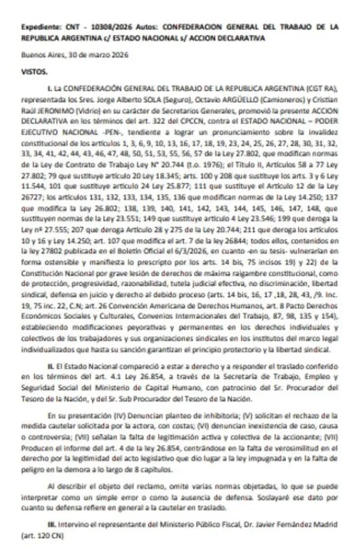 En la cautelar, se asegura que la CGT “posee legitimación activa para impugnar los artículos señalados”, vinculados a los “derechos de sindicalización, negociación colectiva y huelga”, teniendo en cuenta, también, los aspectos “individuales comunes y homogéneos” de los grupos de trabajadores, “cuya prestación se encuentra regulada" por las normas vigentes en nuestro país.