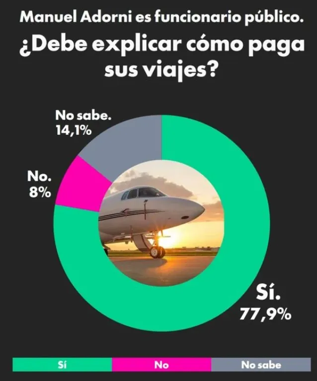 En ese sentido, al ser consultado sobre si Adorni debe explicar cómo paga sus viajes, el público consultado contestó que sí en un 77,9%.