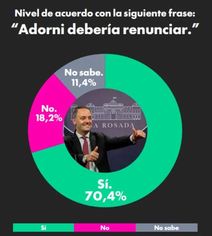 Por otra parte, ante la consulta sobre el nivel de acuerdo con la frase “Adorni debería renunciar”, el 70,4% respondió que sí, mientras que el 18,2% que no.