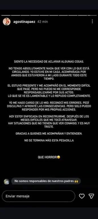 “No tengo absolutamente nada que ver con lo que está circulando. Yo estuve en mi casa acompañada por amigos que estuvieron a mi lado todo este tiempo. Él (su padre) estuvo presente y me acompañó en el momento difícil que pasé. No puedo ni me corresponde responsabilizarme por sus actos”, expresó la joven de 29 años.